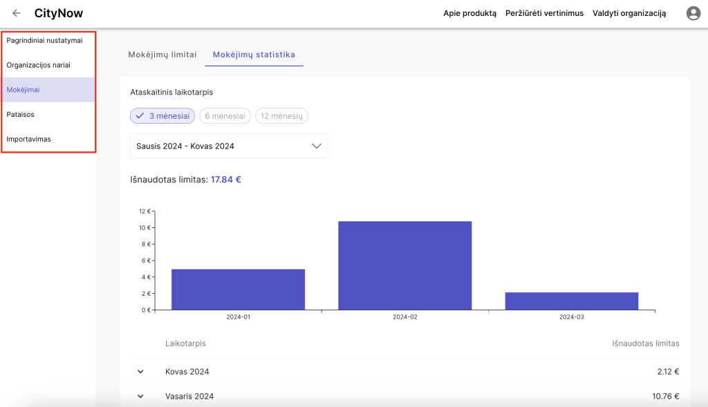 Ekrano viršuje kairėje – jūsų logotipas, kurį paspaudus grįšite į pradinį langą. Ekrano viršuje dešinėje rasite nuorodą į šią dokumentaciją, taip pat įrankius valdyti organizacijos narius ir kitus nustatymus. Paspaudus profilio ikonėlę matysite, kokiu vardu esate prisijungę ir turėsite galimybę atsijungti nuo sistemos.